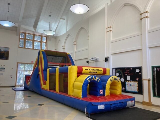 Two lane obstacle course race that is 40ft long. Jump and/or climb over obstacles. Finish off with a slide.